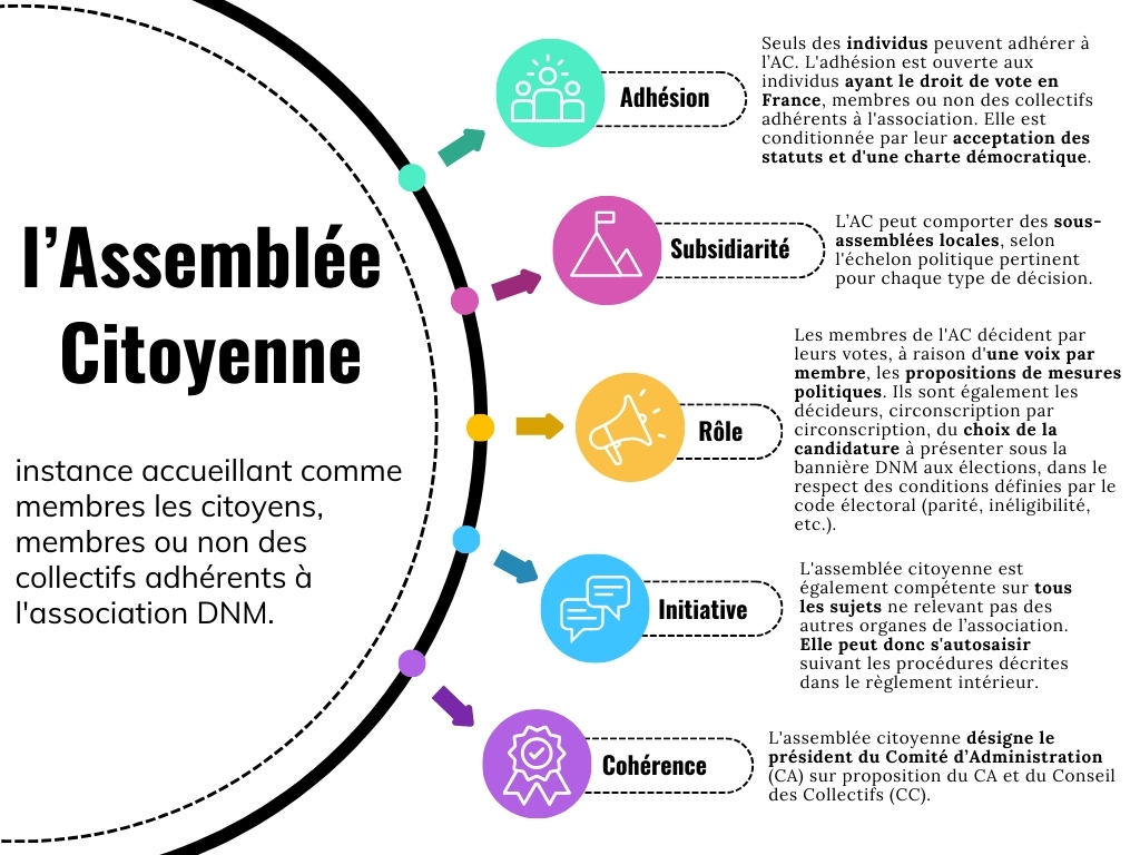 L'assemblée citoyenne (AC) est une des instances de DNM! qui peut s'auto-saisir sur tous les sujets, notamment les mesures politiques, sauf sur ceux dévolus aux autres organes de DNM! selon les Statuts.