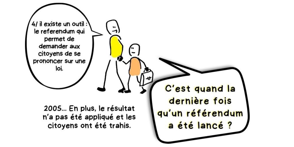 Le constat : les politiciens (qui en font leur métier et carrière) prennent des décisions sur des sujets qui nous concernent. Avec la corruption, les lobbys influencent ces textes qui ne sont pas toujours écrits pour le bien commun ! Trop souvent ils creusent encore plus les inégalités. Nous ne pouvons pas continuer à laisser nos élus décider à notre place !
