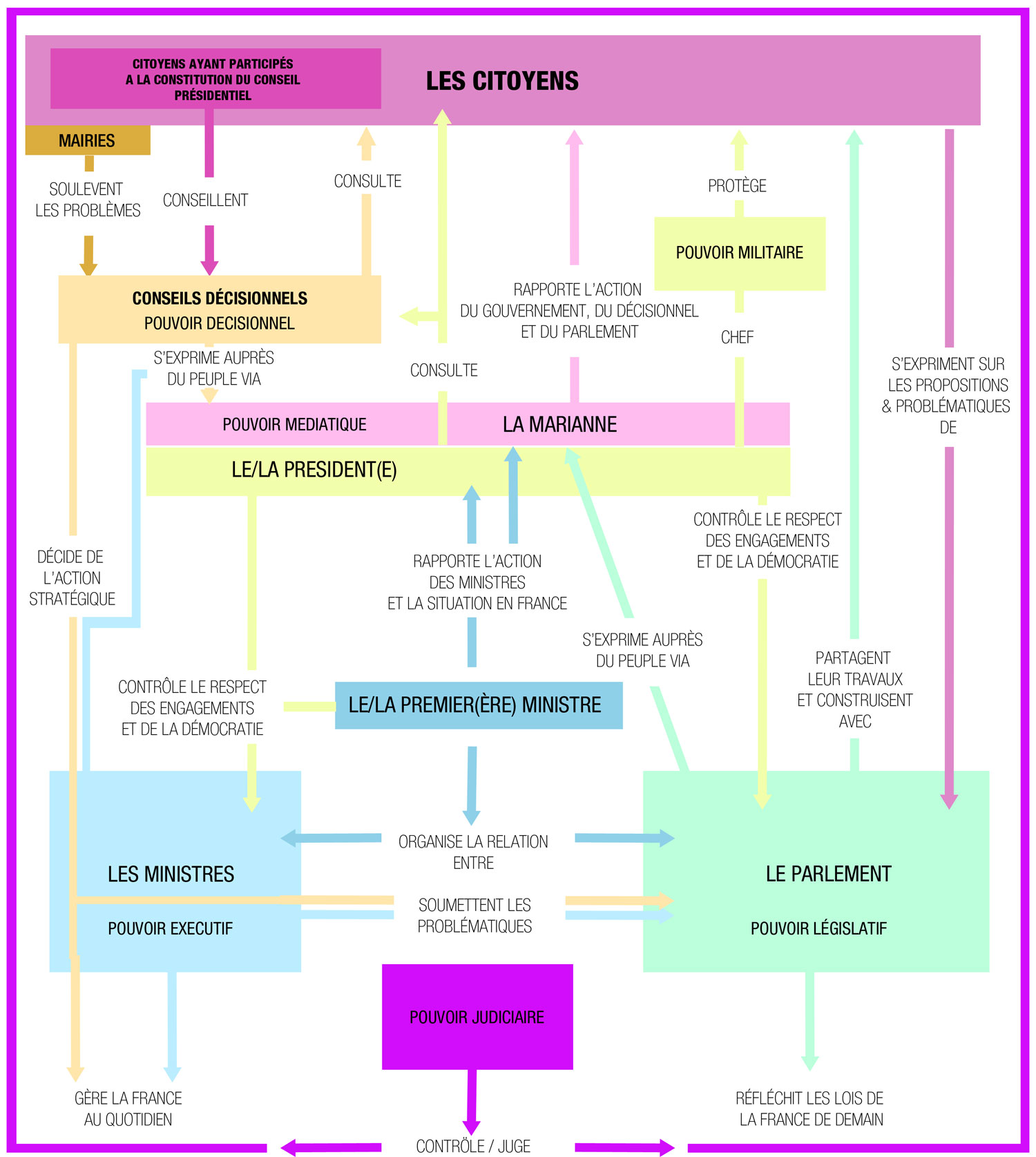 Dans l'attente de la nouvelle constitution, il est déjà important de faire au mieux avec le système dont on dispose. Le premier fondement à respecter est la séparation des pouvoirs. Nous redonnerons à chaque fonction son rôle : Les ministres gèrent la France au quotidien, les députés réfléchissent aux solutions pour la France de demain. Les députés n'ont pas à commenter l'action du gouvernement, le gouvernement n'a pas à imposer des lois au parlement. Chacun se concentrera sur la tâche qui est la sienne. Le président ne sera pas un chef décideur mais simplement un arbitre et le garant de la qualité du travail des ministres et du parlement, tandis que la "Marianne" sera la voix et le visage de la France .
